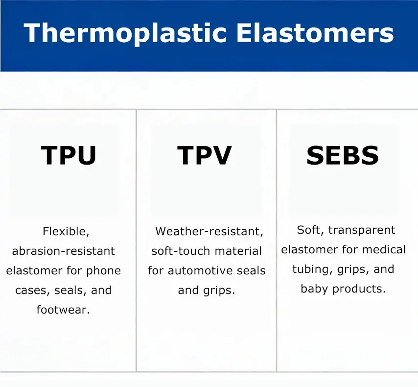 Flexible, abrasion-resistant elastomer combining rubber-like properties with thermoplastic processability, used in phone cases, automotive seals, and footwear.