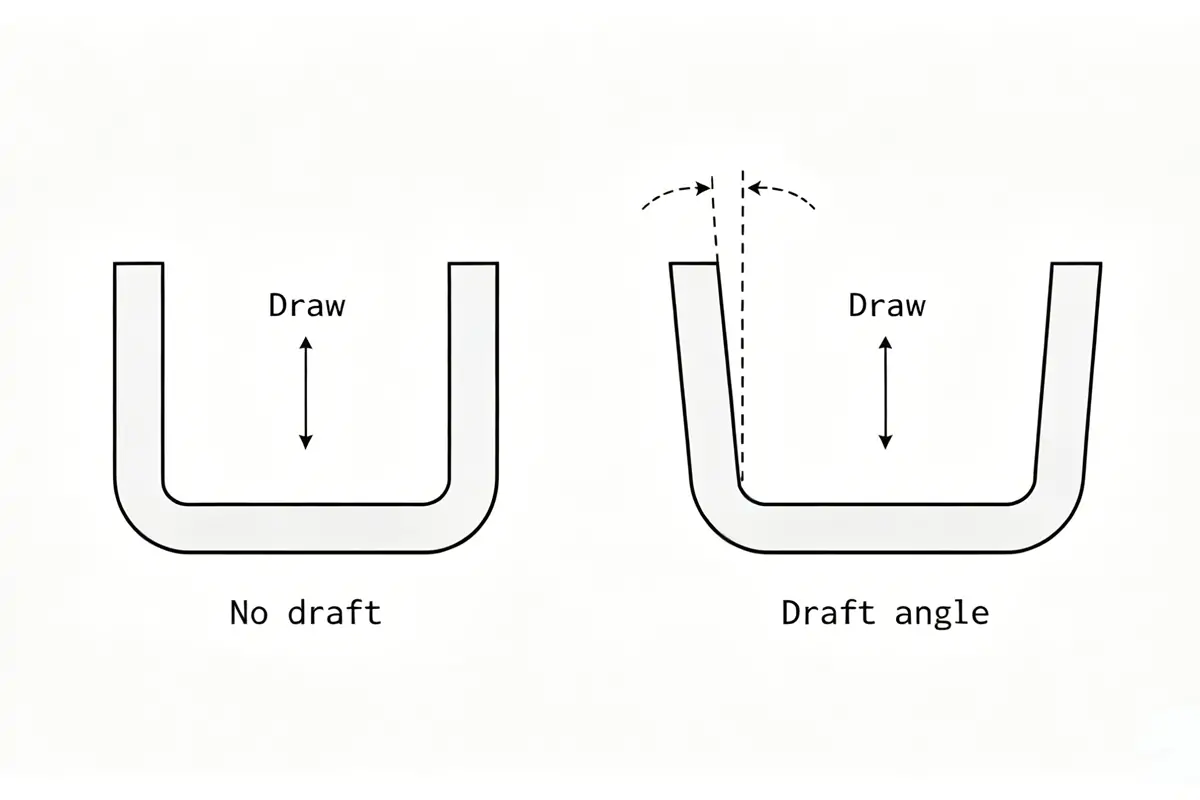 Typical draft recommendations range from 1° to 3°, depending on material type and surface finish requirements.
