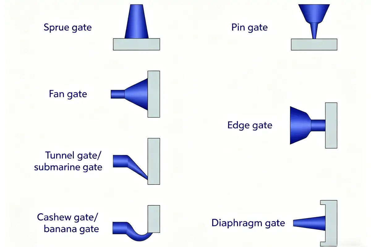 Engineers determine the most suitable injection gate type and position based on flow direction and part geometry.
