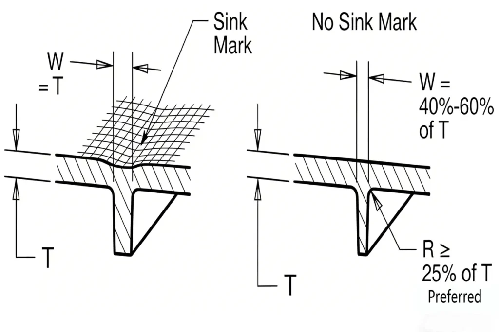 However, oversized ribs may cause sink marks on visible surfaces. Proper rib thickness and spacing help maintain both strength and appearance.